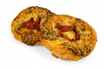 Een heerlijke pizza met een bodem van groene pesto, een topping van lekkere kaas en semi zongedroogde tomaatjes. Om je vingers bij af te likken!