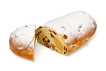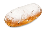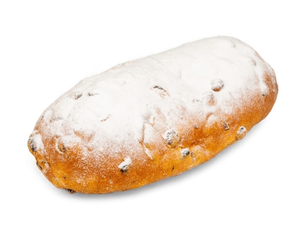 Zacht rozijnenbrood gevuld met spijs en laagje poedersuiker bovenop.